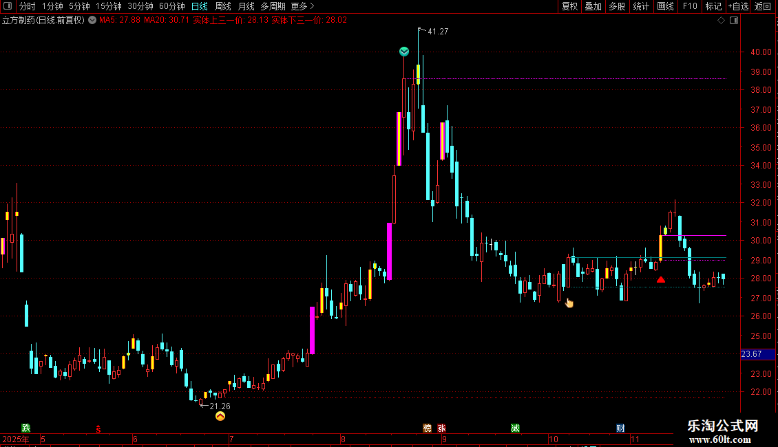 实体下三一价:MIN(OPEN,CLOSE)+ABS(OPEN-CLOSE)/3,NODRAW,COLORRED;