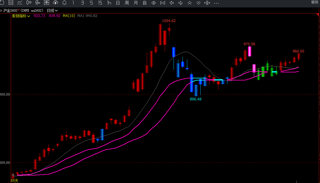 “双龙出海趋势跟踪系统”是文华财经平台上的一款高效技术指标,通过多重移动平均线组合与动态K线着色,直观揭示趋势强弱与转折点。该指标以3日、6日和21日均线为核心,结合价格行为,将市场状态分为四大场景:当短期均线上行且长期趋势向上时,K线以红色系显示多头强势;短期均线下行但长期趋势向上时,以蓝色系标识调整机会;长期趋势向下时,则以绿色和粉色系警示风险。此外,系统辅以EMA通道线(如20日EMA的极值点),动态标注支撑与压力区域,帮助投资者快速识别趋势延续或反转信号。