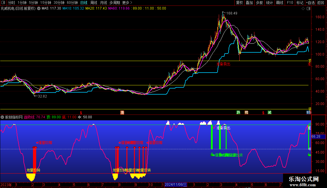 指标通过计算股价在长期周期中的相对位置形成趋势线,结合动态价格区间识别地量反转机会。当趋势线从极低区域向上突破且价格低于地量反转线时产生买入信号;当趋势线进入极高区域且价格高于地量反转线时发出卖出警示。策略分准备与执行两阶段:准备阶段提示潜在机会,执行阶段在趋势确认时操作。