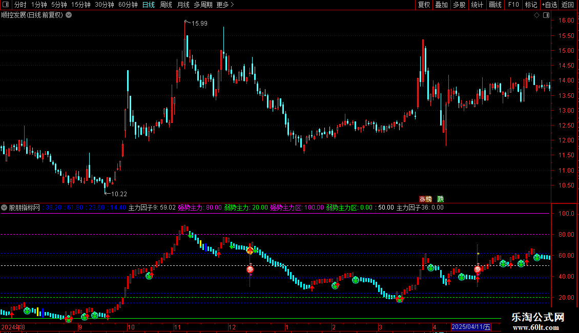 指标通过计算价格在特定周期内的相对位置来判断主力资金动向。核心功能是识别主力控盘状态转换的关键节点,当指标从弱势区突破至强势区时产生买入信号,从强势区回落至弱势区时提示风险。