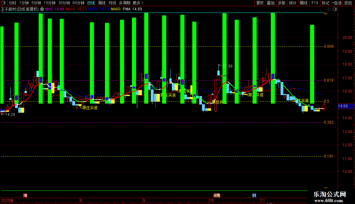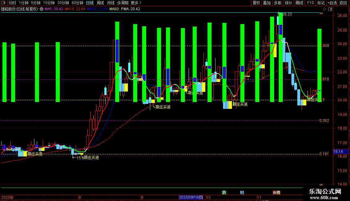 DRAWTEXT(FILTER(买=1,5),LOW-0.05,'↖跟庄买进'),COLORYELLOW;