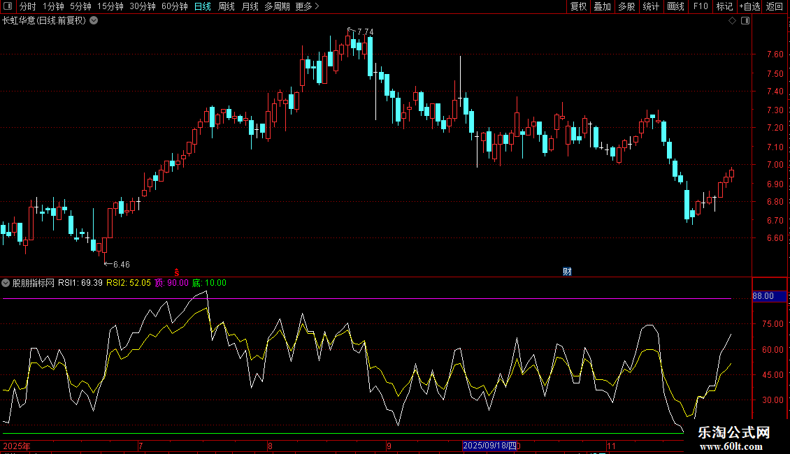 RSI2:SMA(MAX(CLOSE-LC,0),N2,1)/SMA(ABS(CLOSE-LC),N2,1)*100;