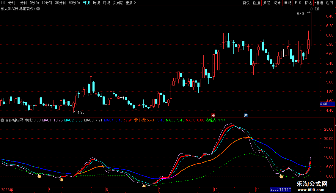 零上强:IF(MAC4>=REF(中线,1),MAC4,DRAWNULL),COLOR0055FF,LINETHICK2;