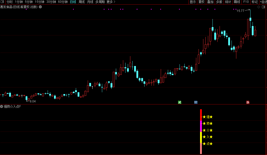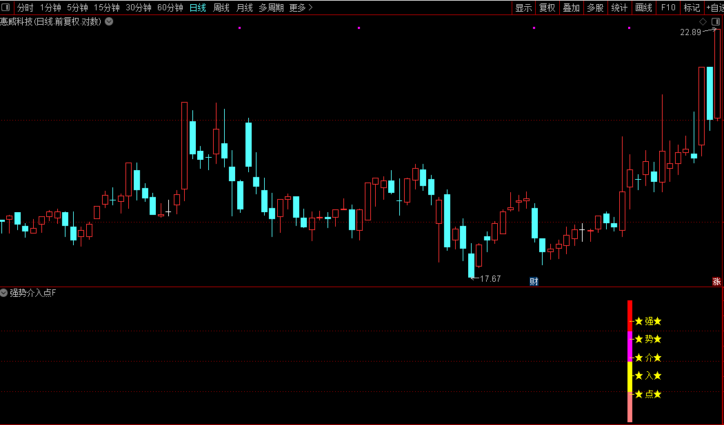 1. 副图应用:在副图区域直接观察“强势介入点”信号标记。当出现红色箭头时,表示符合策略条件,可结合K线位置研判买点。