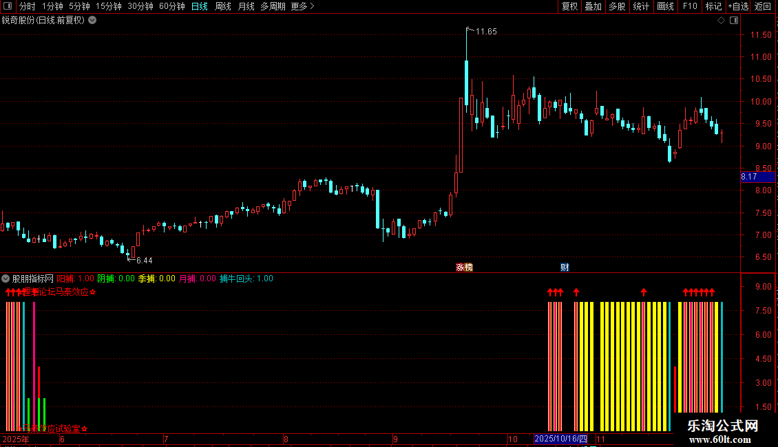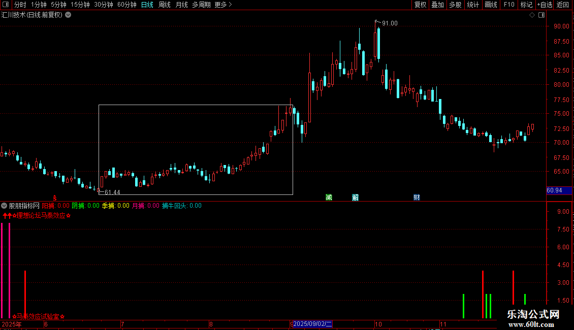 捕牛回头:VAR2<(HHV(VAR2,60))/7 AND C<MA60 AND REF(MA60,1)<=REF(C,1),COLORLIBLUE,NODRAW;DRAWTEXT_FIX(1,0.02,0,0,'☆理想论坛马泰效应☆'),COLORRED;DRAWTEXT_FIX(1,0.02,5,0,'☆马泰效应试验室☆'),COLORRED;