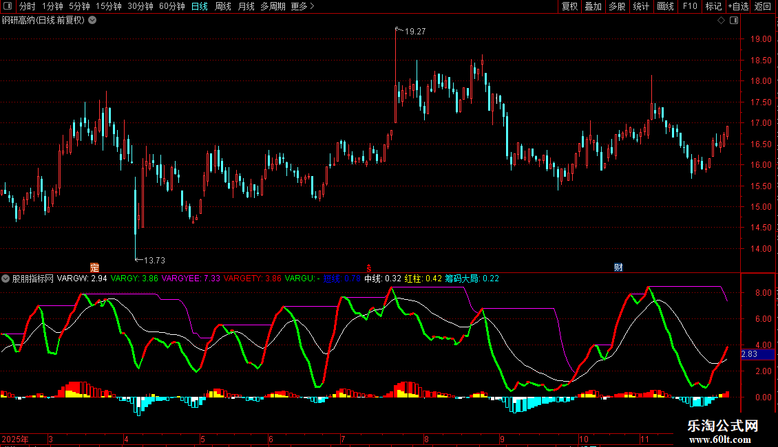 计算短期波动(VARGY)和长期趋势(筹码大局),并用颜色区分上升和下降趋势。