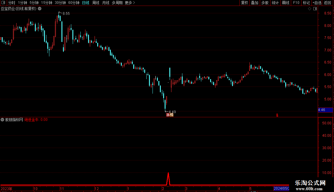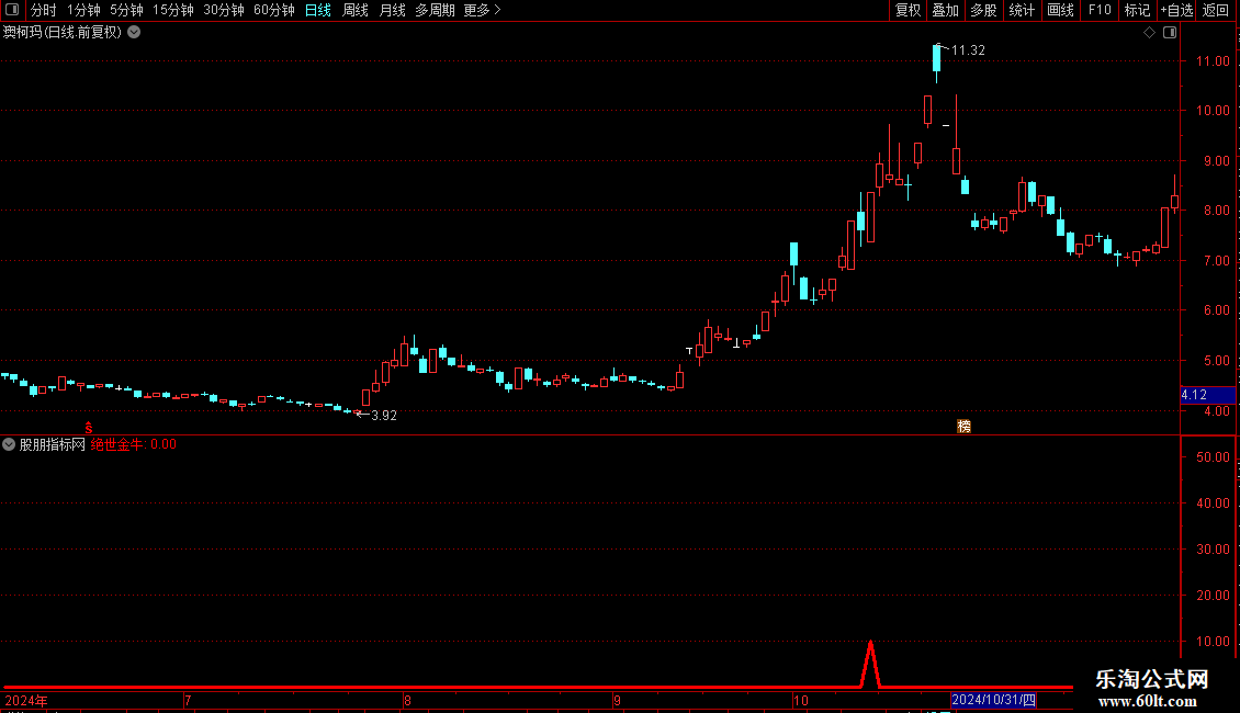 绝世金牛:IF((A AND B AND D AND 避开刀尖 AND COUNT(A AND B AND D,20)=1),10,0),COLORRED,LINETHICK3;