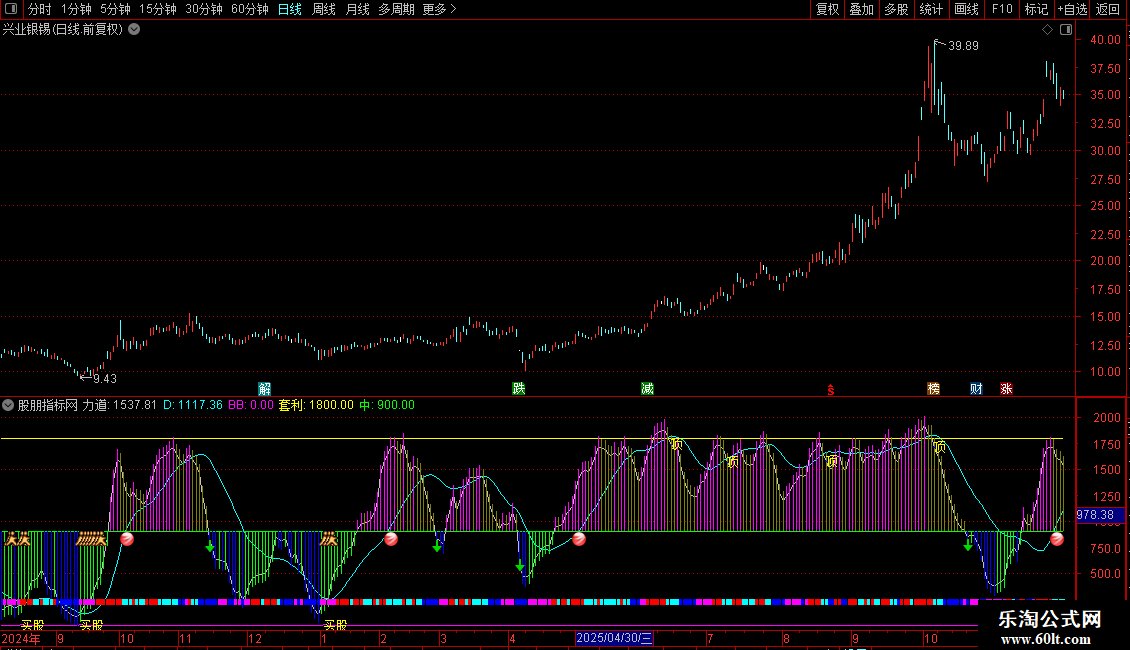 - 买入信号:出现黄色「买股」标记+红色量化信号+力道线上穿中轴