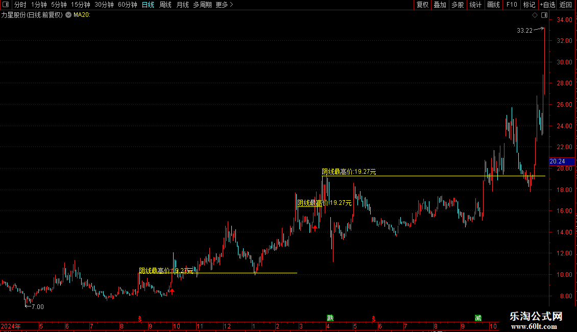 1、指标原理解析:股票涨停后,庄家常打压股价洗盘。大阴线会吓退不坚定投资者,庄家则低位吸筹。当股价突破该阴线最高价,即为分批建仓信号。