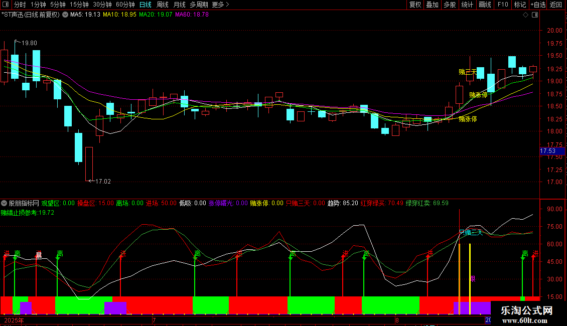 主图核心信号:以 “赌字诀” 系列标识(如 “赌涨停”“只赌三天”)提示入场机会,同时结合短期均线(图中多色曲线)辅助判断趋势强弱,信号出现后需结合个股实际走势进一步筛选;