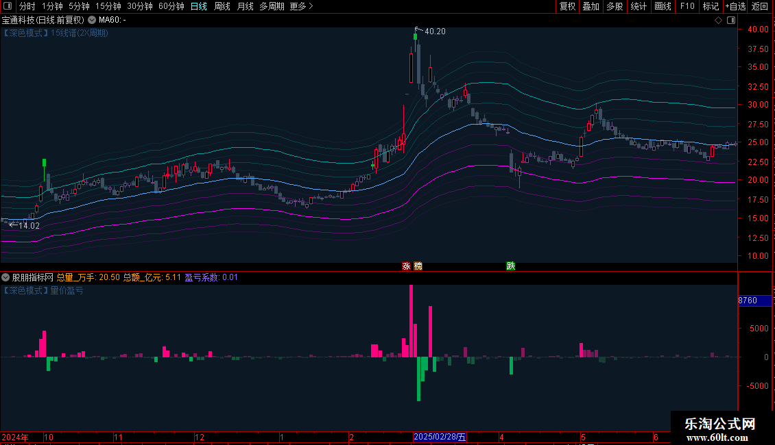 2. 江河横溢(资金盈亏副图):渐变色优化旧作2合1。当CM=1时使用传统的成交量柱状图;当CM=2时使用资金盈亏柱状图,原理是对价格重心涨跌幅作指数级降权,然后直接乘以成交量,就可以作为资金进出的一个参考指标了,可用于选股。