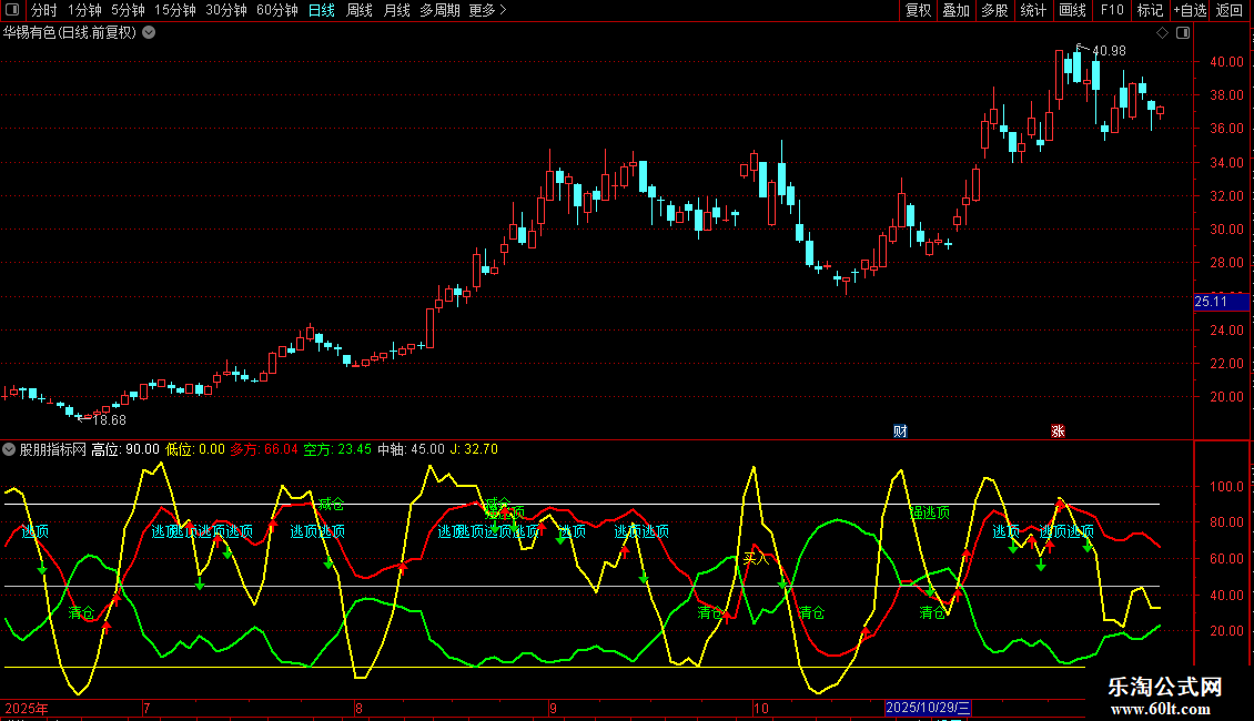 一般逃顶条件:=J线高位拐头向下 AND (MACD顶背离 OR 多方>70);