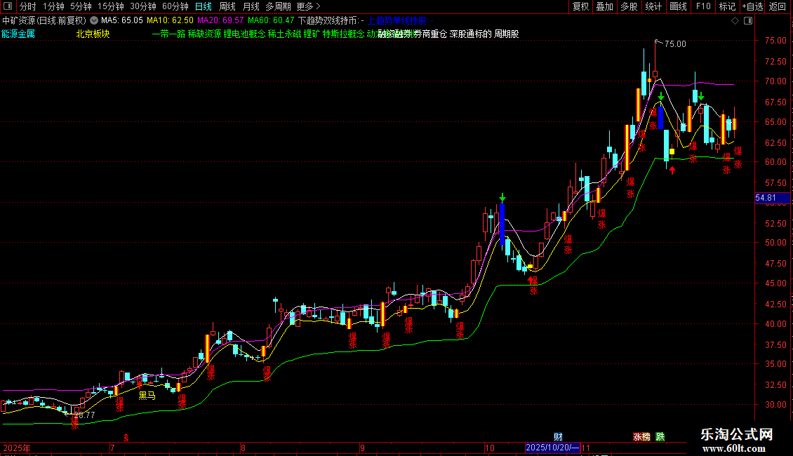 低点:IF(CURRBARSCOUNT<=60, CONST(IF(ISLASTBAR=1,LLV(L, BARSLAST(CURRBARSCOUNT=60)),1)),DRAWNULL),COLORMAGENTA,DOTLINE;