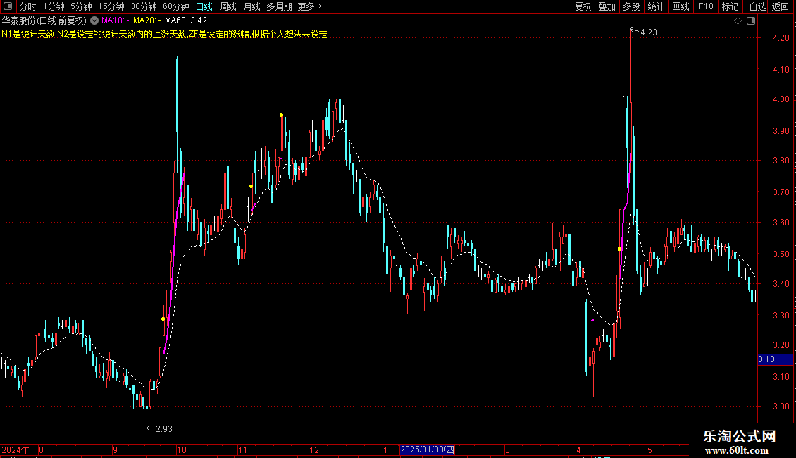 连涨均价:IF(N1天N2收阳成立,收阳均价,DRAWNULL),COLORMAGENTA,LINETHICK2;