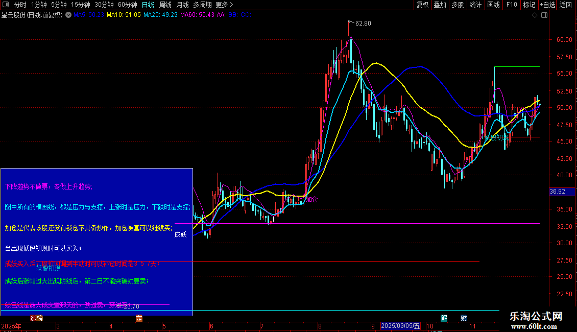 DRAWTEXT_FIX(1,0.008,0.95,0,'绿色线是最大成交量那天的,跌过卖,穿过买;'),COLORMAGENTA;