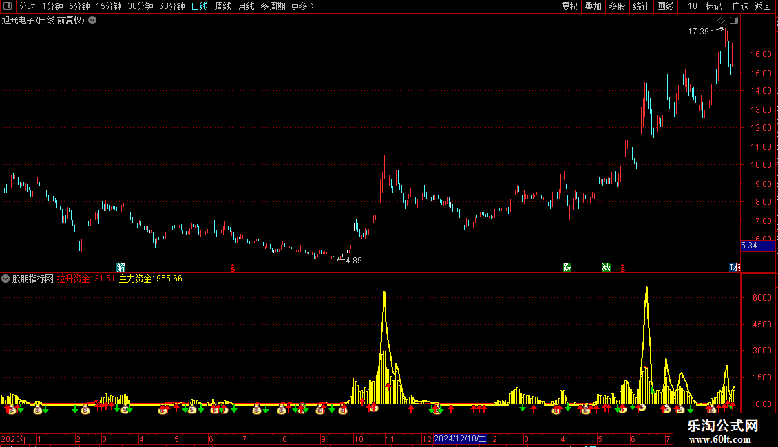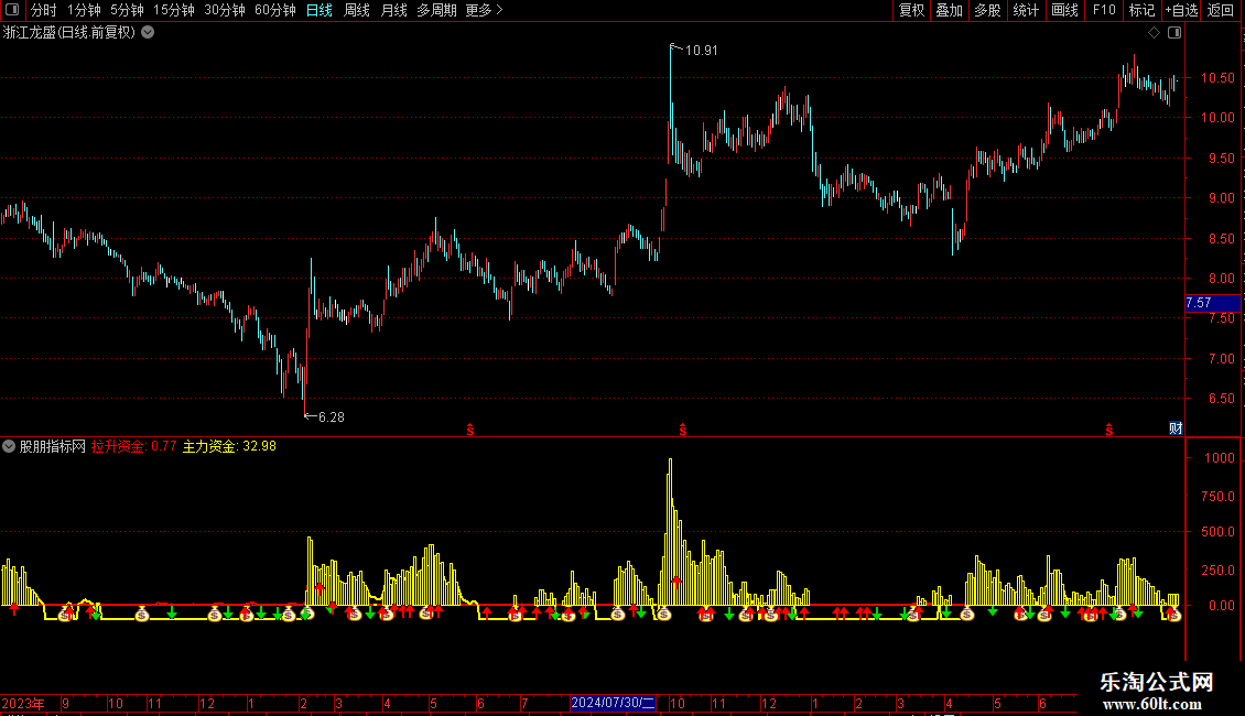 DRAWICON(CROSS(MAZL,ZLGJ) AND MA(C,5)<REF(MA(C,5),1) ,MA(拉升资金,5),2);