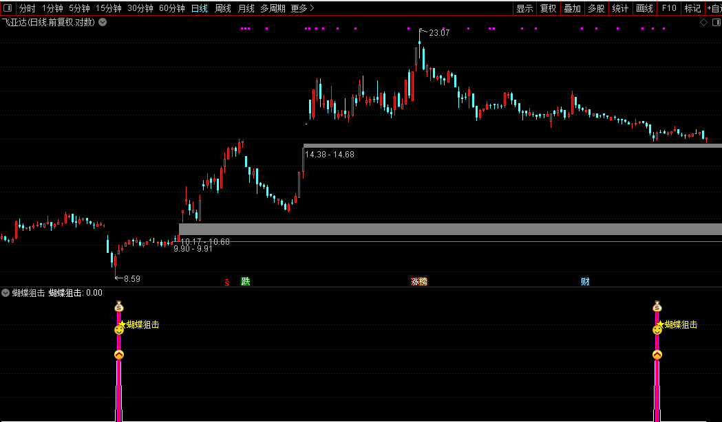 当副图区域出现粉色柱状信号线,并伴有黄色“★蝴蝶狙击”图标及文字标记时,即触发买入信号。该信号通常出现在股价经历短期调整、处于相对低位之际,提示市场短期动能有望转强。