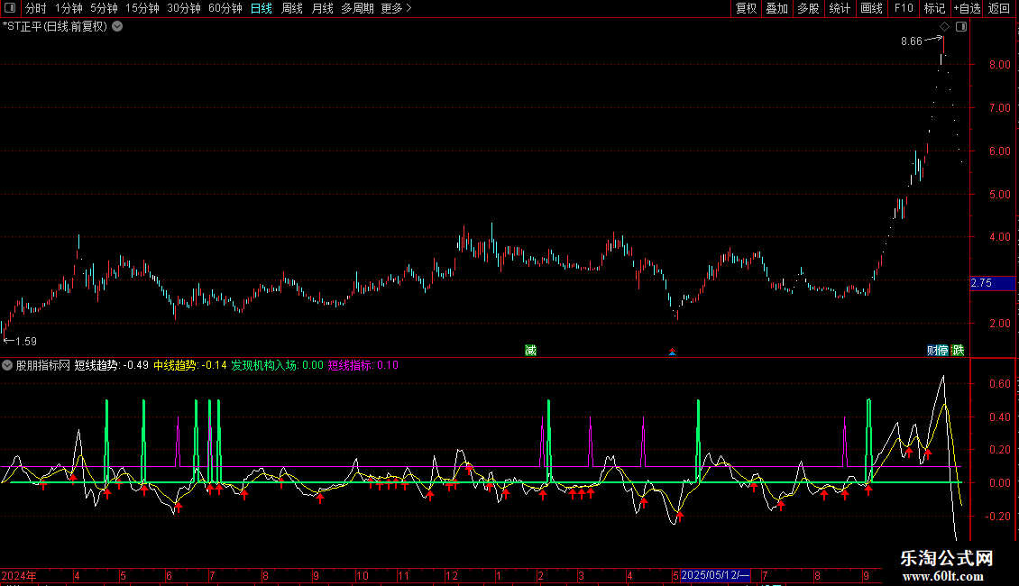 短线指标:IF(((((CROSS(短线趋势,中线趋势) AND (短线趋势 < 0)) AND (中线趋势 < (0 - 0.2)+4)) AND (VAR1 > 45)) AND ((中线趋势 - REF(中线趋势,1)) > 0)),0.4,0.1),COLORMAGENTA;