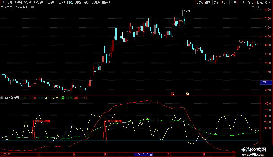 IF(日金叉 AND 周金叉 OR 月金叉,80,0)COLORRED,LINETHICK2;