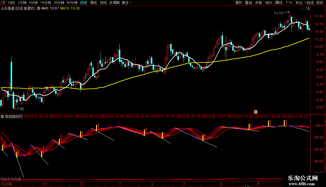3.主图白线上穿黄线金叉,K线高开站上金叉,副图多头趋势线全发散向上即共振买点