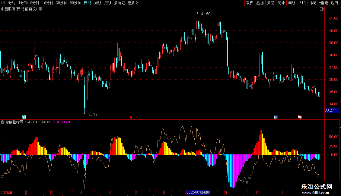 输出RSI:收盘价-LC和0的较大值的14日[1日权重]移动平均/收盘价-LC的绝对值的14日[1日权重]移动平均*100,线宽为0