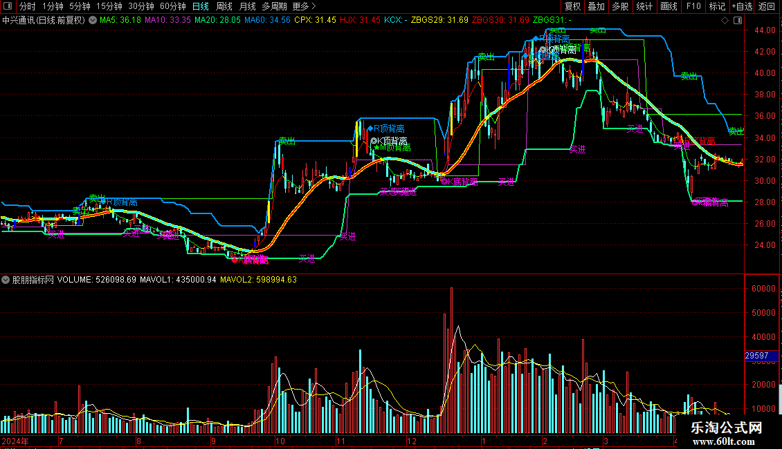 - 买卖点信号:当短期指标上穿长期指标时标记买点(绿色线),下穿时标记卖点(紫色线)。