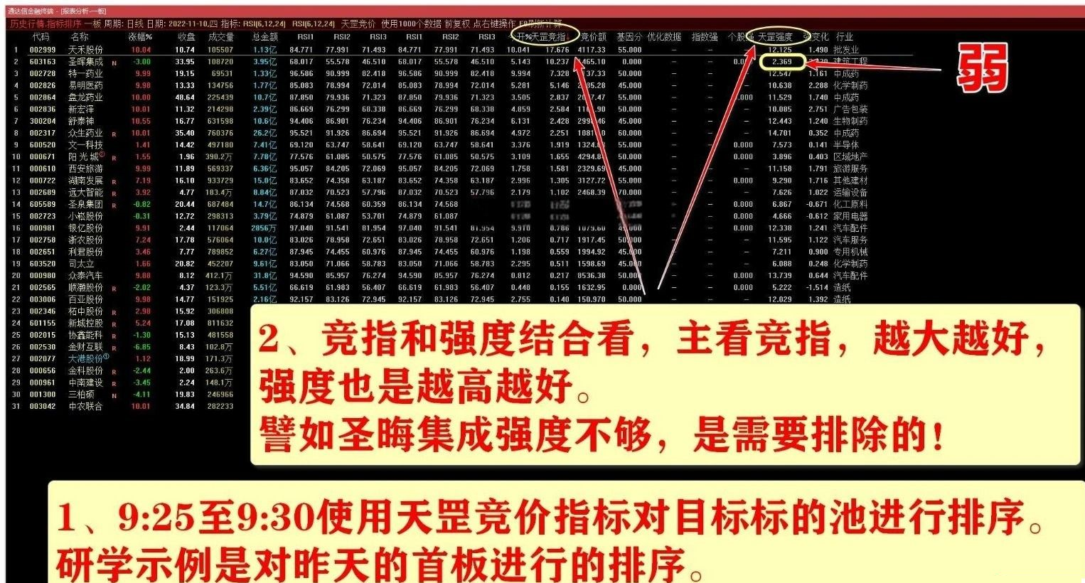 需要对竞价指数和强度指数结合判断,这样对目标池的强度做到心中有数。高强度的可以作为备选标的准备下手了。
