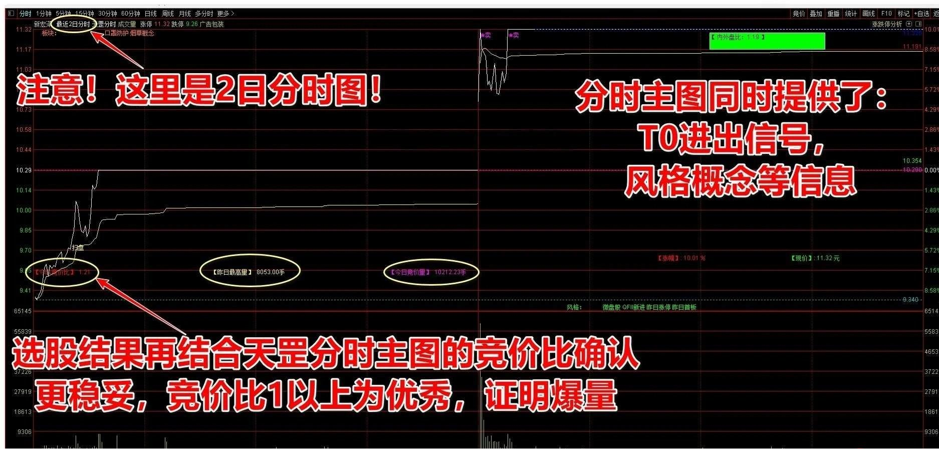 天罡分时主图:天罡分时,两个作用,一是对竞价排序目标标的爆量确认(需要打开2日分时);二是分时进出场点提示,日内T0。