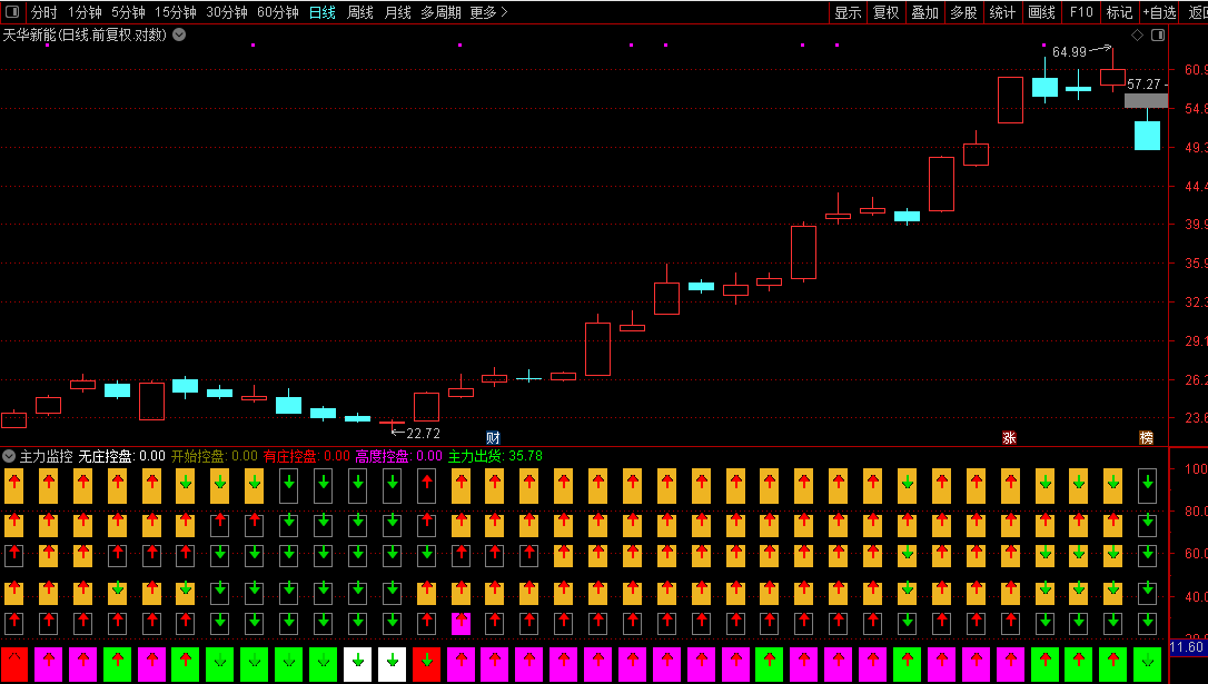指标融合价格、成交量、筹码分布与多周期动量,综合判断市场运行状态。通过加权均价与均线偏离度识别资金成本变化,结合多个周期的随机指标和趋势线,分别评估趋势方向、动能强弱、上涨加速、资金流入及主力控盘程度。操作上,当多个维度同步发出积极信号(如趋势向上、动能增强、资金进场、控盘提升)时,视为较可靠买入时机;反之若出现背离或主力出货迹象,则提示谨慎或离场。界面以彩色条和图标直观展示各模块状态,便于快速决策。