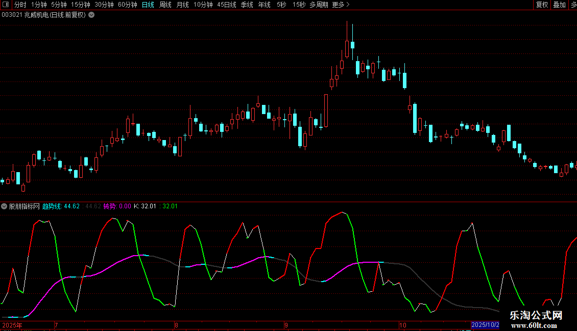 转势:CROSS(趋势线,REF(趋势线,1)),NODRAW,COLORFF00FF;
