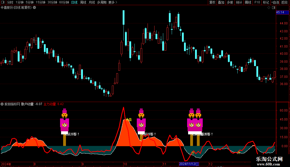 指标融合了随机指标(KDJ)变体、动量对比和相对强弱判断,用于捕捉潜在底部启动机会。通过监测短期价格在近期高低区间中的位置,结合长期与短期均线关系,识别“见底预警”信号。同时,利用散户与主力动量的背离与金叉,判断资金流向变化:当主力动量上穿散户动量且处于低位时,视为上涨启动;若叠加动量回升或极端低位,则触发买入提示。整体策略侧重于在市场情绪低迷、主力悄然介入时提前布局。