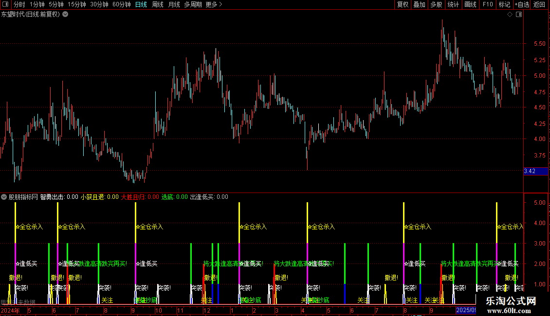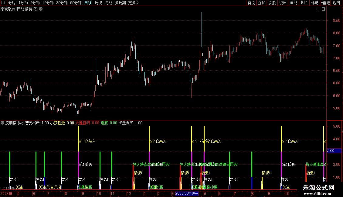指标主要通过价格波动与ZIG锯齿波判断市场转折点,结合短期跌幅和形态识别,寻找低吸高抛时机。当价格连续低于前一日或前两日开盘且下跌时,系统监测潜在底部;一旦ZIG指标出现向上拐点,视为买入信号,并在多重周期共振时提示“全仓杀入”。同时,通过ZIG高点回落、操盘线金叉等条件提示止盈撤退或大跌预警,兼顾进攻与防守。策略核心是“跌后反转介入、涨后高位离场”。