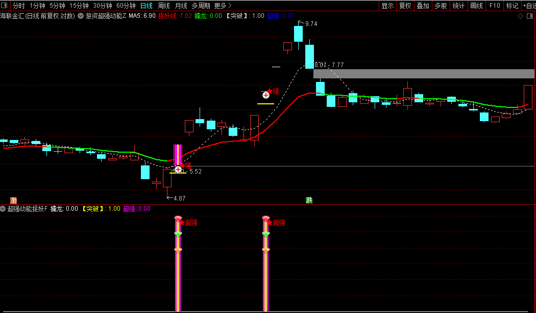 “超强动能”指标(亦称“最强动能”) 是一款集动能分析、强势信号识别、操盘线指引及趋势跟踪于一体的综合性技术辅助工具。其核心目标是识别市场中最高级别的动能信号,为使用者提供清晰的交易决策支持。