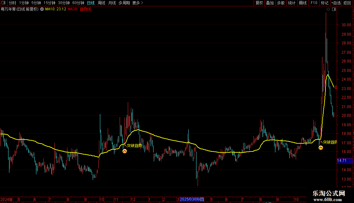DRAWTEXT(突破信号,L*0.99,'↖突破趋势'),COLORYELLOW;