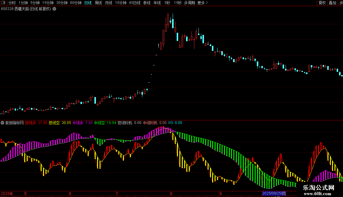XG:短线时机 AND 中线时机 AND 短线多>中线多 AND DYNAINFO(4)>0,COLORCYAN,NODRAW;