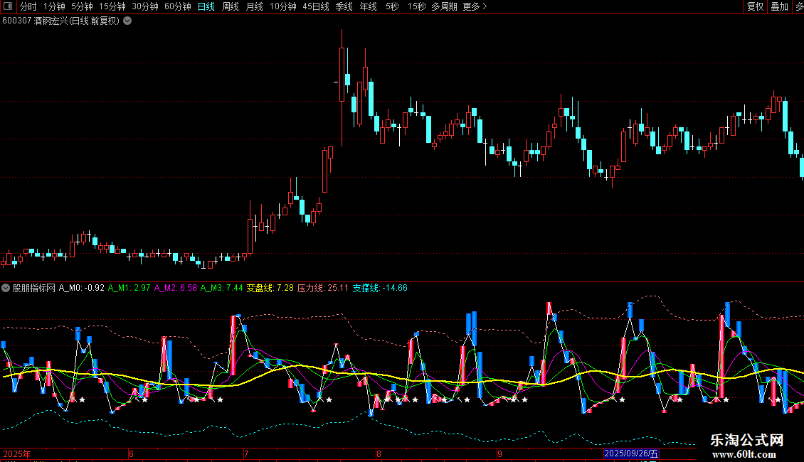 DRAWTEXT(CROSS(KML,0) AND A_M1<变盘线 AND KML<变盘线,0-0.8,'↖★'),COLORWHITE;