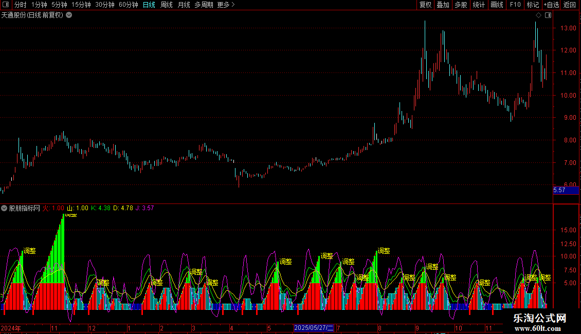 DRAWTEXT(REF(火,3)>0 AND REF(火,2)>0 AND REF(火,1)>0 AND 火=0 AND REF(火,1)>山,REF(火,1),'调整'),COLORYELLOW , ;