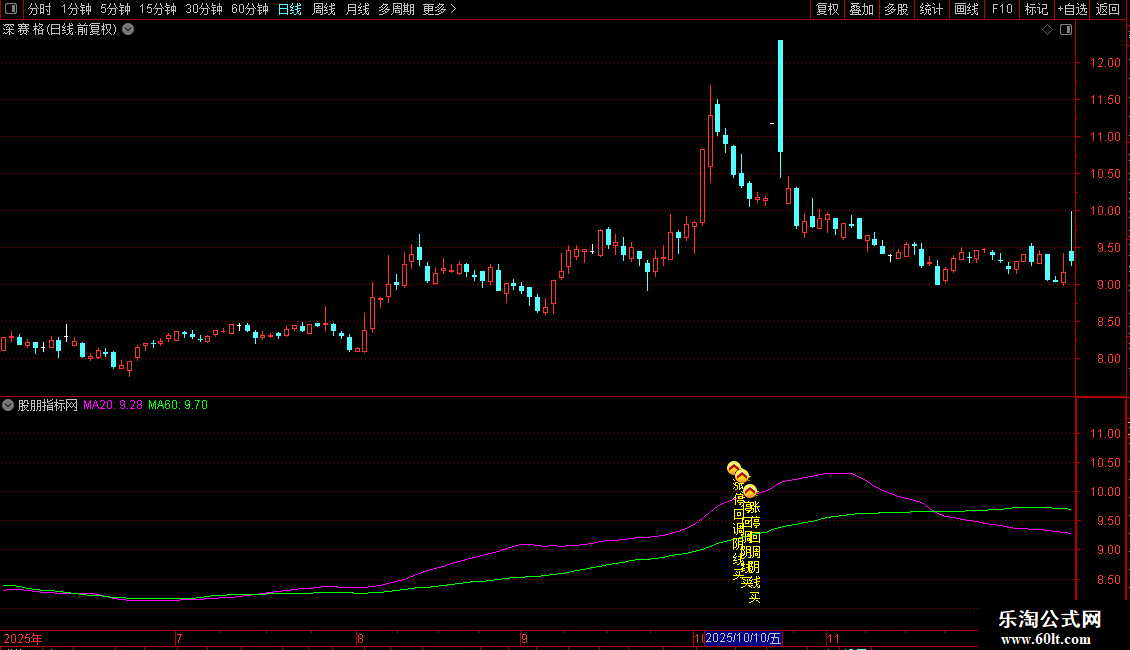 MA10:=MA(C,10)COLORYELLOW;
