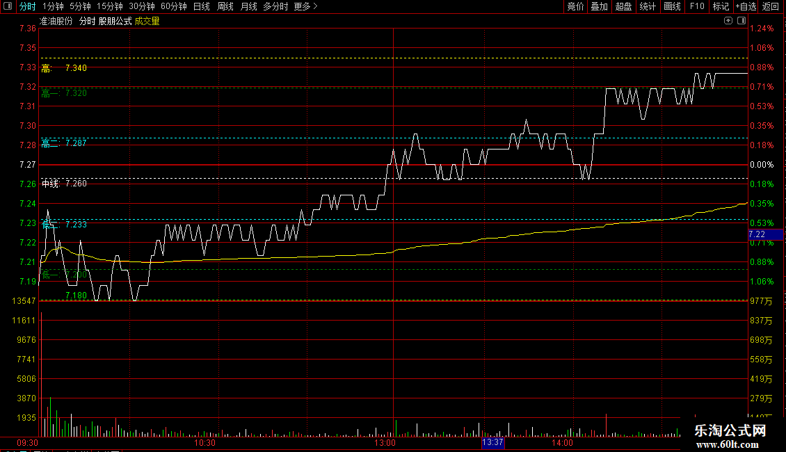 高低分割分时组主图指标是通达信软件中针对分时行情分析的实用工具,核心功能为基于当日分时走势的高低点数据,自动绘制黄金分割比例的分割线,并清晰标注 “高、中、低” 核心档位,以及 “高一、低一、高二、低二” 等细分分割位。该指标依托黄金分割的经典理论,以分时图中的当日最高价、最低价为基准,等关键黄金分割比例,自动完成画线操作,无需手动调整。画线结果直观呈现在分时主图中,“中” 位对应 0.5 分割线,是多空博弈的核心分水岭;“高一 / 高二” 向上延伸至高位分割区,“低一 / 低二” 向下覆盖低位分割区,快速识别分时行情中的支撑与压力位,为判断提供清晰的参考