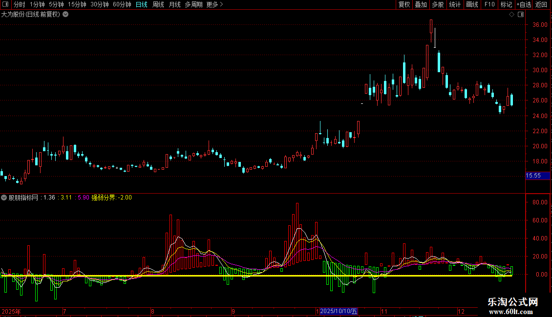 指标通过对比当前与前期筹码获利比例的变化,结合成交量方向,构建一个反映主力资金流入或流出的“筹码强弱”信号。当短期筹码能量上穿其长期均值时,视为资金积极介入,以红色柱体提示偏强;反之则为资金流出,用绿色柱体提示偏弱。配合多条平滑均线和固定强弱分界线,帮助判断市场情绪处于强势还是弱势区域,辅助决策低吸或高抛时机。