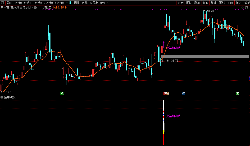 空中续航指标就是选取的主升浪启动初期形成空中加油形态的个股,后期有更高的拉升空间。指标条件严格,信号较少,最近3个月30多只信号,行情走好,进入主升浪的票多的时候,信号会适当增加。也很好的规避了行情整体不好的风险。