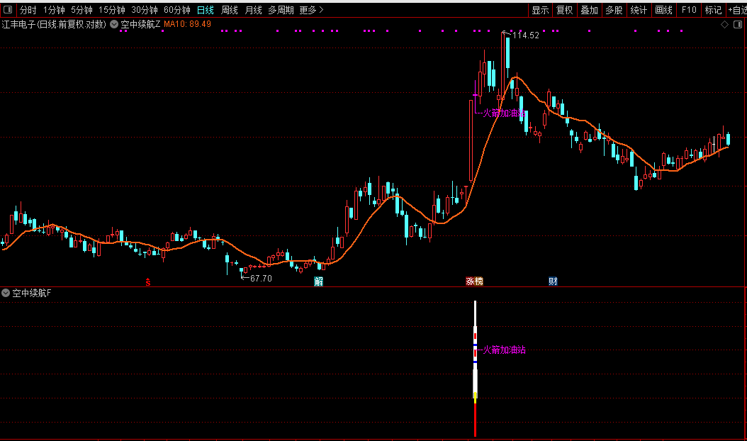 一、指标设计理念:空中加油在股票市场中,通常指主力在拉升一只股票的过程中,进行的暂时性的休整。这种休整的目的是为了清除浮游筹码,以便后期再次大幅上涨。这个过程就像飞机在空中加油一样,为后续的飞行(股价上涨)提供动力。