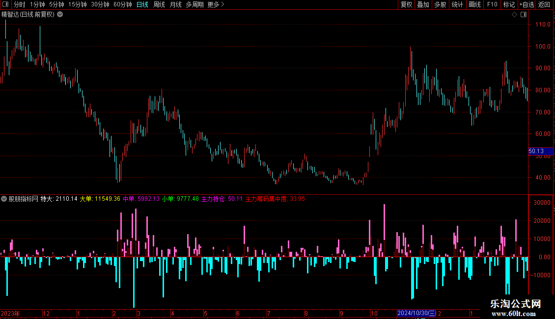 STICKLINE(进出量>0,0,进出量,0.5,0),COLORCC66FF;N:=1;QJ0:=(HIGH+LOW+CLOSE)/3;
