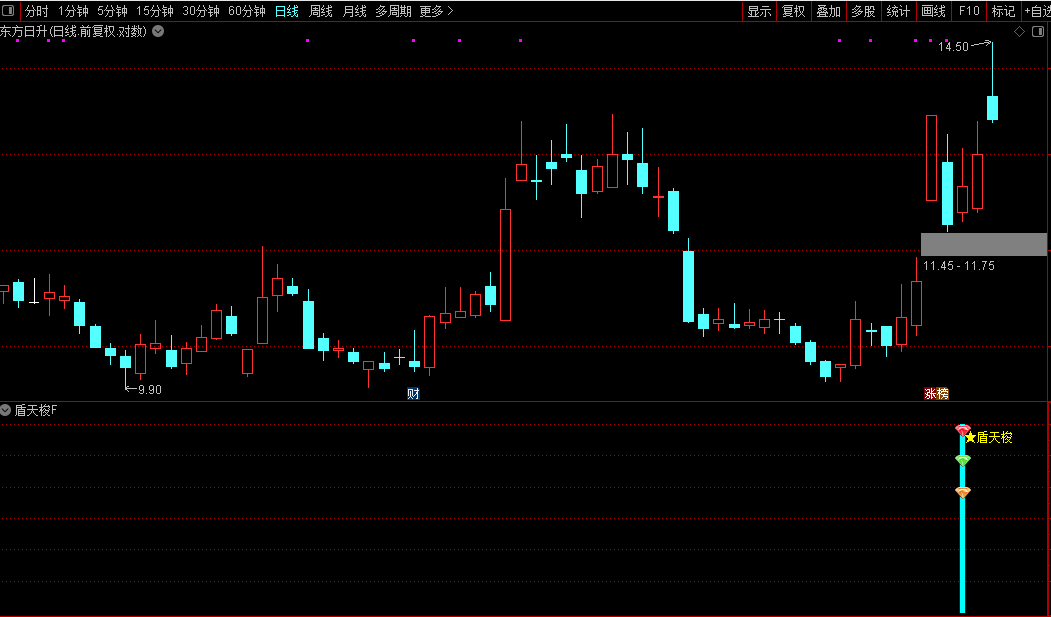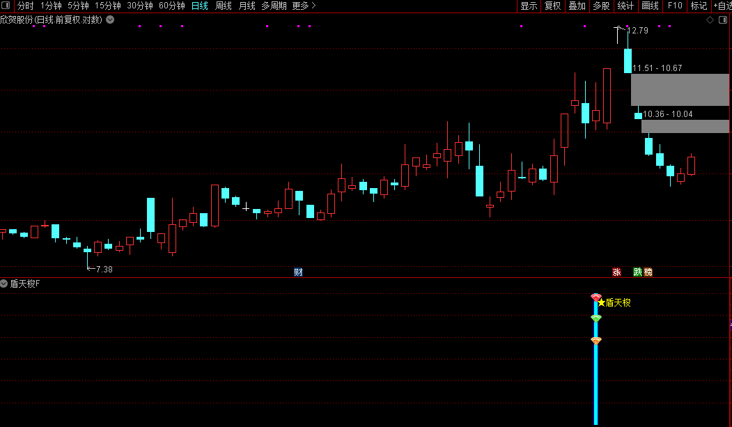 指标通过加权价格与短期均线的偏离程度,构建一个反映市场短期动能的震荡信号。当价格在特定历史周期内出现极端波动,并满足连续三日的特定涨跌组合(先阳后大跌再小幅反弹)时,触发“盾天梭”信号,提示潜在的反转或反弹机会。策略上用于捕捉急跌后的短线买入点。