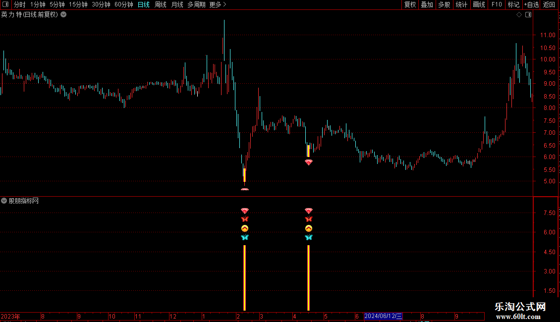当满足核心条件时,公式会以粉黄双色K线+底部预警图标发出明确信号,辨识度极高。