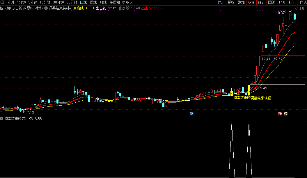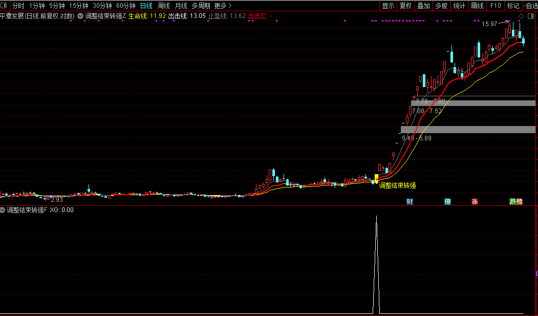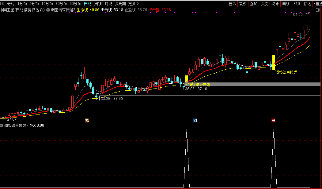 当主图出现黄色 K 线 +“调整结束转强” 黄色文字时,为最优买点,可结合当日成交量(放量更佳)择机介入。