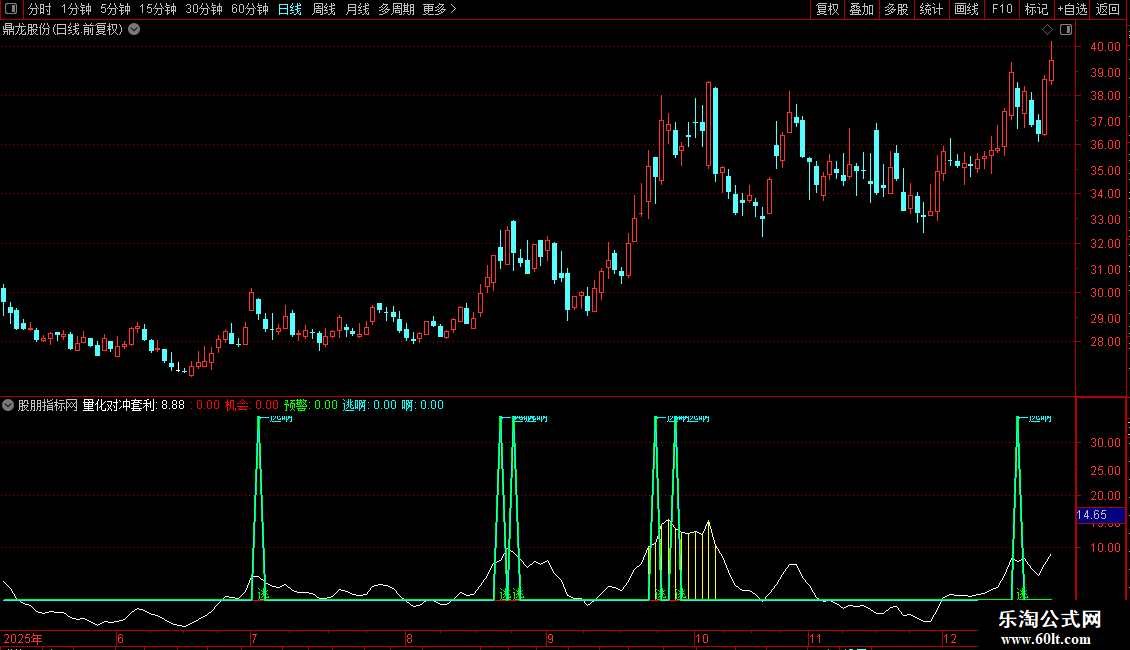 指标融合了多种技术手段,用于识别市场中的低吸机会与高风险逃顶信号。一方面,通过加权价格偏离均线的程度构建“量化对冲套利”线,并结合类似KDJ的动量指标与多周期均线乖离综合判断超跌区域;当多个条件共振显示市场处于深度调整状态时,发出“机会”提示。另一方面,利用RSI高位回落作为预警,一旦进入超买区并拐头向下,即标记“逃顶”信号。操作上,可在出现“机会”信号时分批布局,在“逃啊”信号出现时及时减仓或离场。