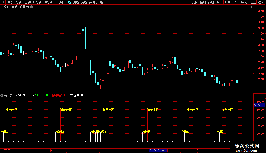 指标通过比较股价在近期高低点区间中的相对位置,构建出两条平滑曲线,用以捕捉短期价格动能的变化。当快线向上突破预设阈值时,视为强势信号,提示“猎杀庄家”;当指标回落至低位区域,则标记为“异动”,暗示市场可能出现异常波动或主力动作。整体策略偏向短线交易,适用于震荡或启动初期的行情识别。