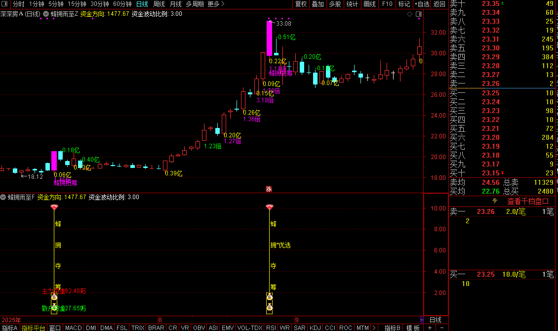 2.洋红色:蜂拥抢筹文字+蜂拥抢筹K线+主力资金尾盘标注+资金背离倍数一代表【核心抢筹信号/主力