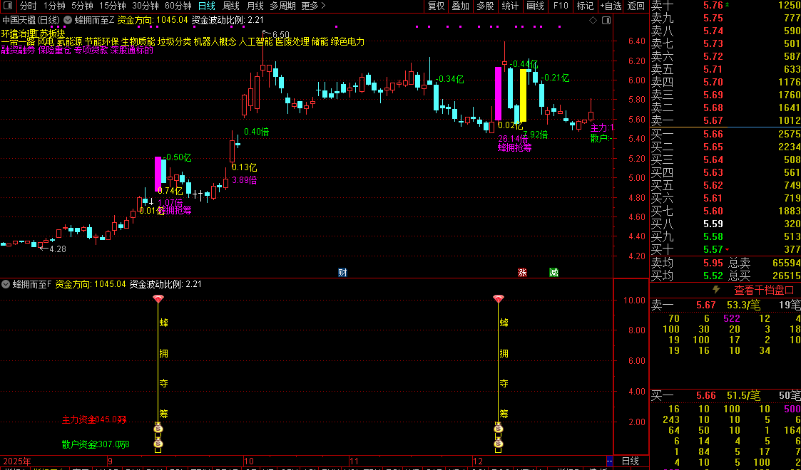 2.K线下方:资金博弈倍数、蜂拥抢筹信号、主力净流入金额;